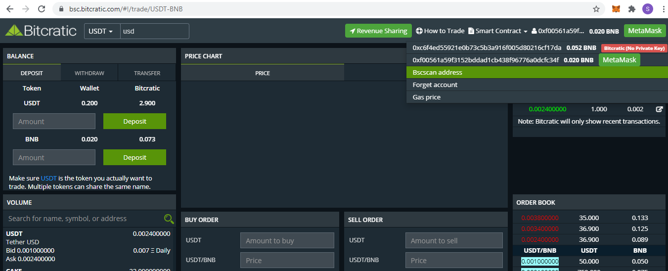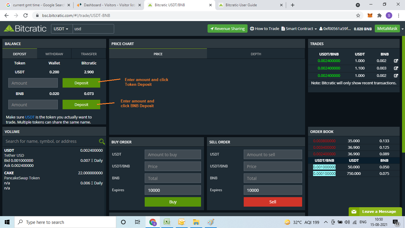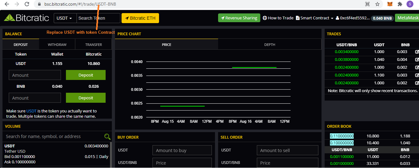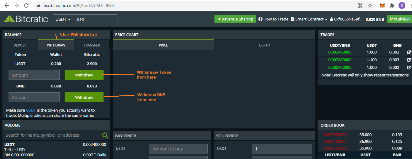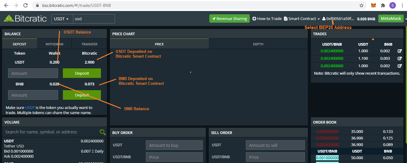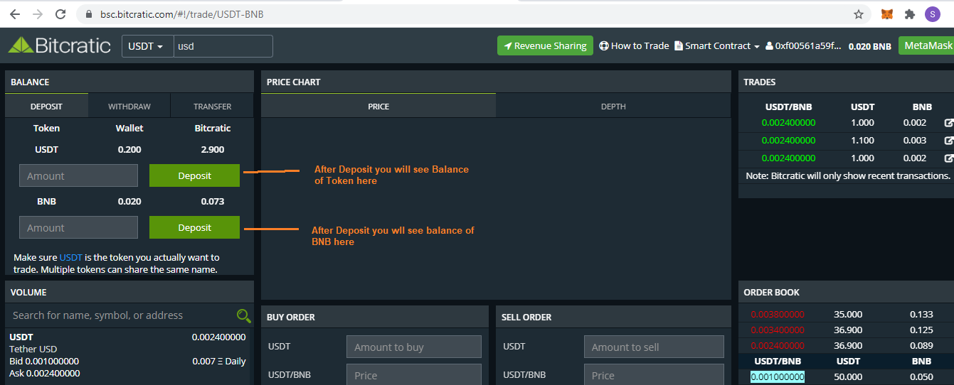 Since now your BEP20 Address is connected with Bitcratic, you can deposit Token/BNB to Bitcratic Smart contract for Trading.