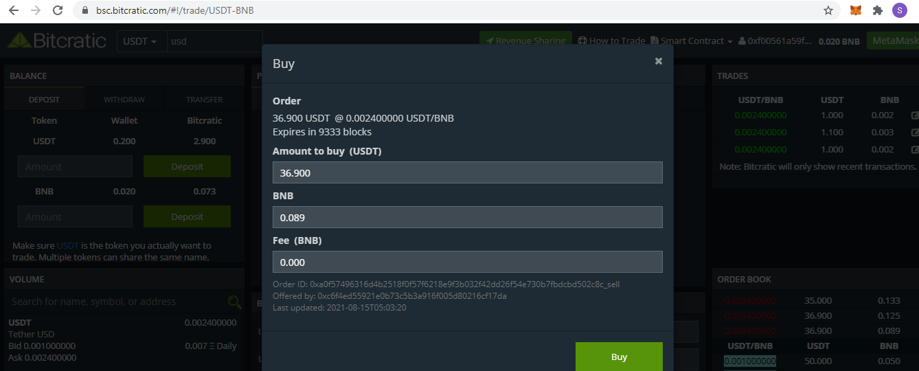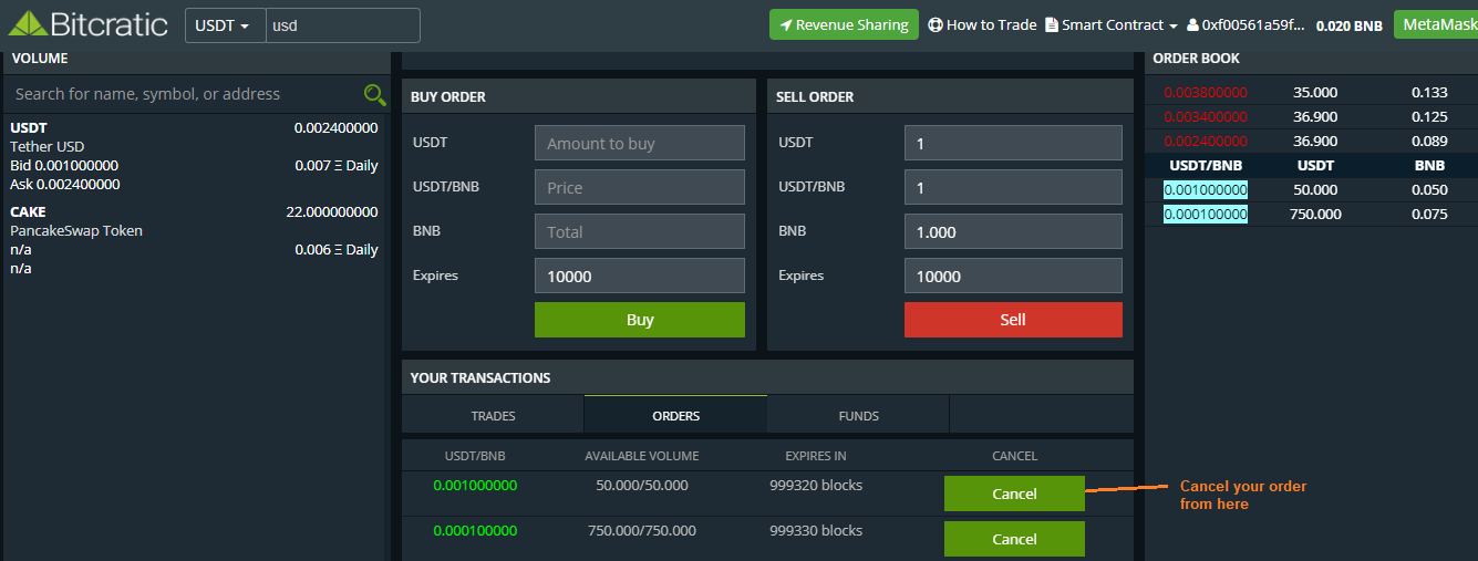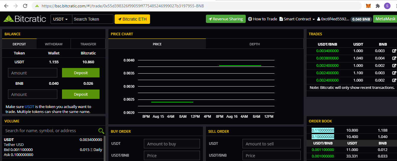 Once Meta Mask is connected, you can see the balance of Token/BNB in your wallet. Let say I want to trade USDT, I will go to USDT trading page https://zeus.bitcratic.com/#!/trade/USDT-BNB